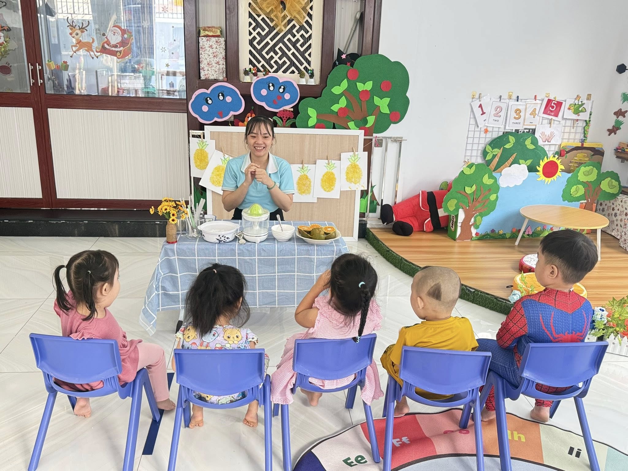 Không chỉ dừng lại ở việc học kỹ năng, các cô còn lồng ghép kiến thức về dinh dưỡng. Các bé được hiểu rằng nước cam chứa rất nhiều Vitamin C giúp tăng cường sức đề kháng, giúp cơ thể khỏe mạnh để vui chơi và học tập.
